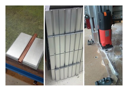 Bereits im Mai 2017 hat Philipp die meisten Teile gefertigt oder gekauft. Ursprünglich will er die Wärme von den Rohren über massive Kupferblöcke auf die Aluminium-Kühlelemente übertragen. Das Kupfer für die Kühlkörper würde aber 70 Kilogramm wiegen und um die 1000 Franken kosten. Zu teuer und zu schwer, um’s an die Wand zu hängen. Die Lösung sind Heizplatten, die bei Bodenheizungen verwendet werden. Die wiegen pro Quadratmeter ein Kilogramm und kosten 40 Franken. Die Kupferrohre werden in die Bodenheizplatten gelegt und geben so die Wärme über Leitbleche an die Aluminium-Kühlkörper ab.