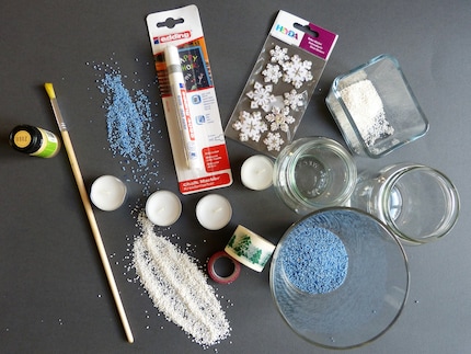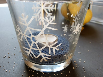 Nimm den Kreidemarker zur Hand. Bemale das Glas unterschiedlich mit verschiedenen Schneeflöckchen oder -männern und lasse die Farbe anschliessend trocknen. Dann kannst du das Glas mit Dekogranulat befüllen, ein Teelicht reinstellen und fertig ist das erste Windlicht.