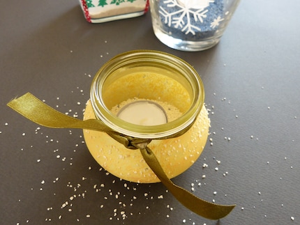 Dies ist die einfachste Variante: Deko-Sticker aufkleben, Geschenkband herum binden, mit Dekogranulat und Teelicht befüllen und fertig ist das Windlicht!