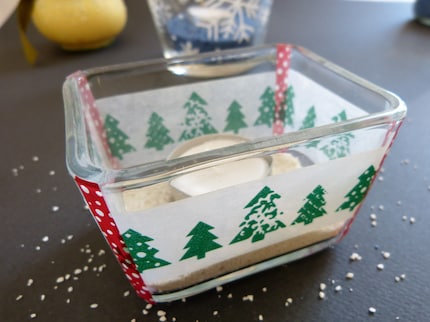 Je nachdem wie dick dein Masking-Tape ist, kannst du dein Glas unterschiedlich bekleben. Vielleicht mag dein Kind ganz viele kleine Stücke vom Tape abreissen und klebt sie dann kunterbunt darauf. Lass dir etwas einfallen, wie ihr das Glas mit Tapes dekoriert. Den Rest kennst du: Glas mit Dekogranulat und Teelicht befüllen und du hast dein Windlicht.