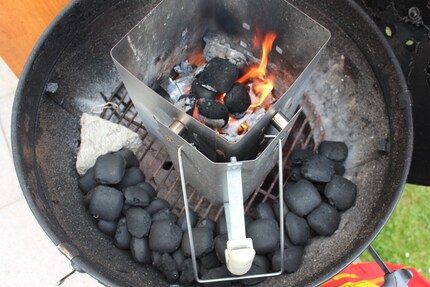 Mit dem Grillkamin ca. sechs Briketts durchglühen.Im nächsten Artikel zeige ich dir, wie man mit Hilfe des Minion Rings im Kugelgrill ein paar wunderbare 3-2-1-Ribs zubereiten kann. Bis dahin, viel Spass beim ausprobieren!