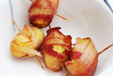 Einmal mehr verwenden wir Bacon, um unserem Starter das gewisse Etwas zu verleihen. Leg eine Scheibe auf ein Brett aus und leg ein Stück Banane darauf. Schlag den Bacon einmal über und dann noch einmal seitlich um, so dass die gesamte Banane mit dem Bacon ummantelt ist. Mit einem Zahnstocher kannst du das Ganze einfach fixieren.
