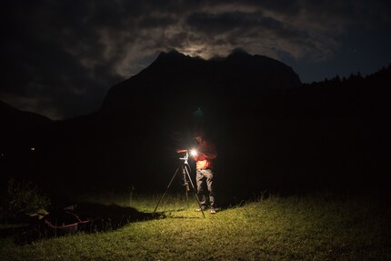 Inzwischen ist es dunkel und empfindlich kühl geworden, die Finger werden klamm. Was muss jetzt abgeschraubt, was angesetzt werden? Irgendwann hält die Nikon endlich am Teleskop und zieht schwer daran. Wir müssen es ausbalancieren und die Schiene neu justieren, womit am Himmel natürlich gar nichts mehr stimmt. Verschiebst du das Teleskop nur ein kleines bisschen, siehst du nur noch schwarz und musst es neu ausrichten. Die Neuausrichtung wird durch ein paar Schleierwolken erschwert und der Mond hat auch langsam genug. Er stürzt immer schneller auf die Berggipfel zu, während Tom, der jetzt tief in die Knie gehen muss, um das Kameradisplay zu sehen, erste Testfotos schiesst.