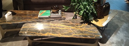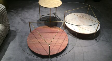 Steinplatten auf Beistell- und Esstischen gibt es neu in weiteren Farbstellungen. Nicht selten sind die Trendmateriale Nussbaumholz und Marmor gemeinsam anzutreffen.