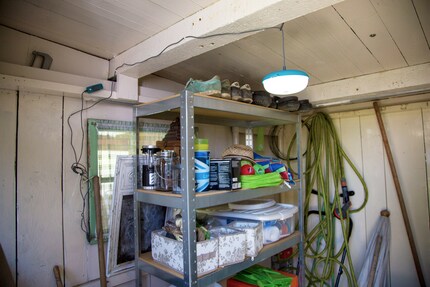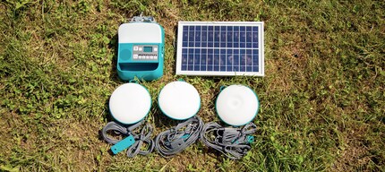 Schaltkasten, Solarpanel und Lichter des Solarhomes.Das Solarhome ist ein kompaktes und mobiles Energiepaket. Das 6-Watt-Solarpanel soll zusammen mit dem 20-Wh-Kontrollkasten drei Hängeleuchten und ein Radio betreiben können. Laut Biolite ist dieses System bereits in 5 000 Häusern in Westkenia im Einsatz. Auf dem Papier hört es sich nach der perfekten Lösung für meinen Schrebergarten an. Zeit also, das Ding auszupacken und dann geht's ab in den Garten damit.