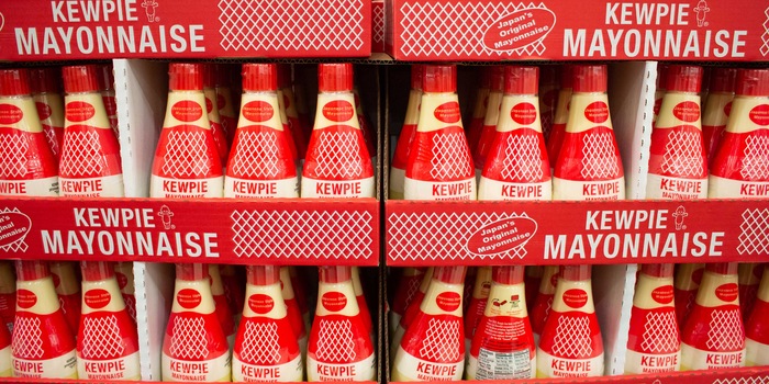 Es muss vor etwa zehn Jahren gewesen sein, als ich im japanischen Fachgeschäft erstmals auf Kewpie gestossen bin. Die tropfenförmige Originalflasche aus Japan sieht absurd aus. Sie steckt in einer Zellophanverpackung, auf die eine Babypuppe gedruckt ist. Die Flasche selbst, aus weichem Kunststoff gefertigt, ist unbedruckt. Sie liegt in meinem Kühlschrank wie ein Trinkschlauch aus dem alten Rom, gefüllt mit dem goldenen Nektar der Götter.
