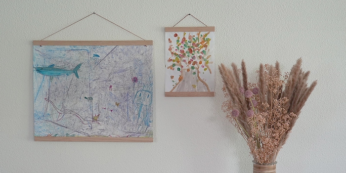 Was du nicht wegschmeisst, pappst du an die Wand. Wenigstens einen Teil. Mit einer Posterleiste haben wir zwei Vorteile: Wir spannen die Zeichnungen schnell und einfach zwischen die Leisten. Und: Wir können sie immer wieder auswechseln. Das bringt Abwechslung an die heimische Kunst-Wand.