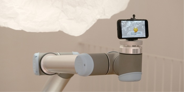 An einem Roboterarm befestigt, wird das Handy in eine künstliche Wolke gehoben, in der es eine visuelle Allegorie dessen entdeckt, was darin liegen könnte. Und das ist einiges, wie ich später sehe, als es wieder zurückkommt. Von Bildern, Textfetzen bis hin zu irgendwelchen Emojis sehe ich in einem Video danach, was sich dort abspielt. Da es sich aber nur um eine Simulation handelt, ist nichts Spannendes für mich dabei ...
