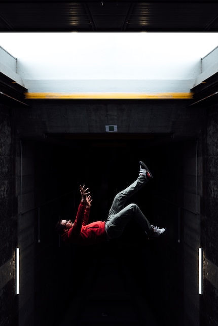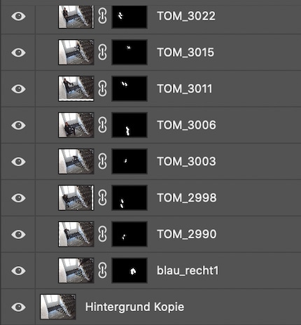 Erst beim Betrachten am Computer stellt Tom fest, dass eines der Sprungbilder gut funktioniert, wenn es um 90 Grad gedreht wird. Das Eingangstor der Garage wird zum Loch, in das Tom hineinfällt. Die Körperhaltung passt dazu. Um die Illusion eines Schachts zu verstärken, kopiert Tom die dunkle Seite und spiegelt sie am anderen Bildrand.