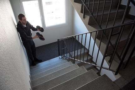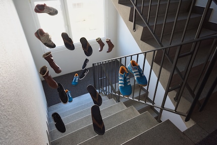 Tom lässt als Testlauf Schuhe im Treppenhaus schweben. Die Sache mit dem Nylonfaden gibt er schon nach dem ersten Paar Schuhe auf und hält alle weiteren in der Hand. Denn die am Faden aufgehängten Schuhe drehen sich ständig.