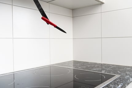 So nimmt Tom dasselbe Messer mehrmals auf. Erst im Nachhinein merkt er, dass zumindest die unteren Messer sich im Herd spiegeln müssten. Um etwas Zeit zu sparen, schneidet er die Spiegelungen nicht aus, sondern kopiert die Messer und setzt sie als Spiegelung im Herd ein. Mit der Spiegelung rechts stimmt jedoch etwas nicht.