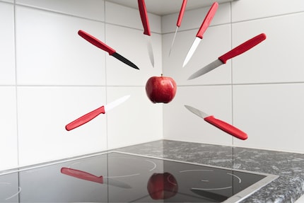 Nun etwas, das vermeintlich näher am Original ist: Schwebende Messer in der Küche. Tom klebt das kleine Rüstmesser mit Patafix an ein Brotmesser. So kann er es im Raum platzieren, ohne es mit Fingern zu bedecken.