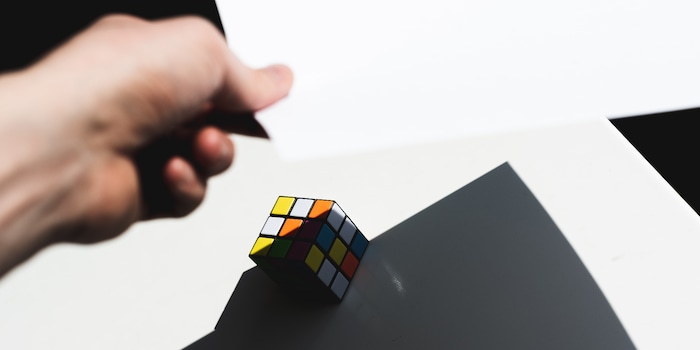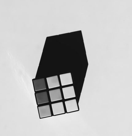 Längst nicht jeder komplizierte Schatten erzeugt auch ein gutes Bild. Und interessanterweise klappt auch das Gegenteil sehr gut. Nehmen wir zum Beispiel einen Würfel. Eine langweiligere Form gibt es kaum. Doch die simple Geometrie und ihr Schatten erzeugen sehr klare Formen und Linien. In Kombination mit Schwarzweiss und harten Kontrasten wirkt das erst recht streng. Alles ist maximal vereinfacht. Das hat eine ähnliche Wirkung wie ein Logo.