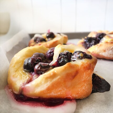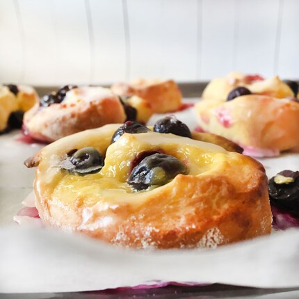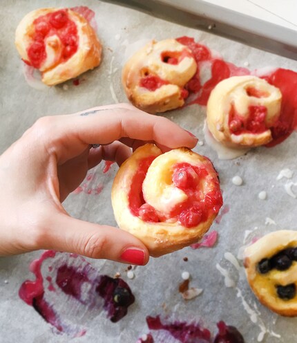 Die Herstellung der Puddingschnecken gibt zwar meistens eine kleine Sauerei, aber es lohnt sich wirklich. Ich habe Heidelbeeren und Johannisbeeren verwendet – du kannst dich natürlich auf eine Sorte Beeren beschränken. (Dann empfehle ich sehr, die Puddingschnecken mit Johannisbeeren zu backen).