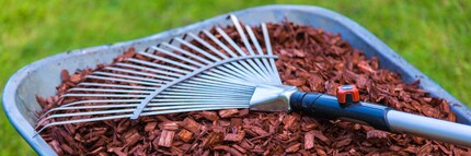Eine gute Idee ist es, Rindenmulch auszugeben. Die groben Stücke verhindern einerseits das Austrocknen des Bodens. Obendrein verlangsamen sie die Ausbreitung von Unkräutern. In der kälteren Jahreszeit verhindert Rindenmulch dann die Auskühlung des Bodens. Und schliesslich zersetzt er sich innert zwei bis drei Jahren und liefert dem Boden wertvolle Nährstoffe.