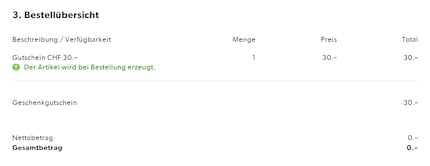 Mit diesem Gutschein kann ich nun fast alles für fast jede*n kaufen. Wenn etwas weniger kostet, verbleibt ein Restguthaben. Wenn etwas mehr kostet, muss ich die Differenz berappen. Der Einfachheit halber kaufe ich mir etwas, was genau 30 Franken kostet. Was kostet genau 30 Franken? Richtig: Ein Geschenkgutschein für 30 Franken.