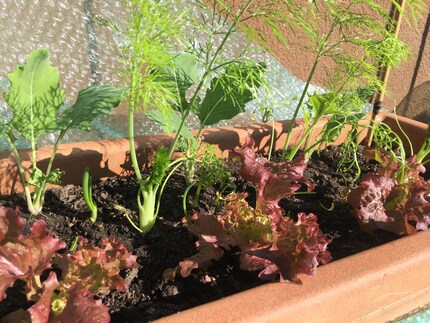 Rucola, Radieschen, Buschbohnen, Feldsalat, Kräuter, Kresse, Erbsen