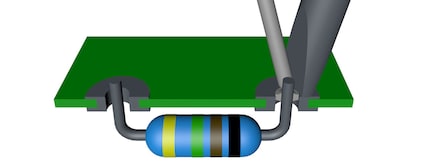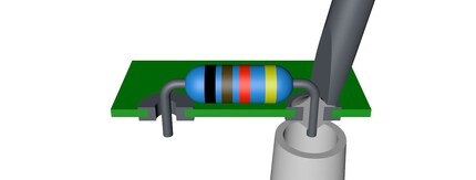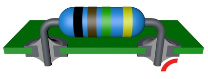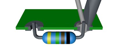 Nun setzen wir den neuen Widerstand ein und befestigen ihn, damit er nicht verrutscht. Das kann man mit einer Klemme, einem wärmefesten Klebeband – ich benutze Maler-Abdeckband – oder einem Bestückungsrahmen tun. Wichtig ist, dass das Bauteil fest sitzt. Die Anschlussdrähte des Widerstands sollen vor dem Löten gekürzt werden. Abschneiden nach dem Löten kann die Lötstelle beschädigen.