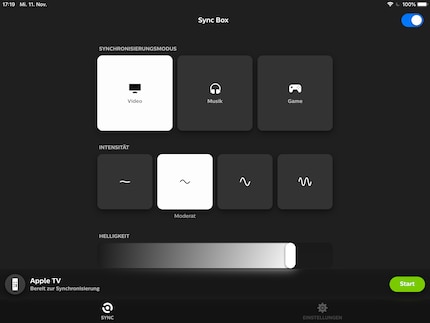 Über deren vier HDMI-Eingänge kannst du Videoquellen mit dem TV verbinden, die mit dem Gradient Lightstrip und deinen farbigen Hue-Leuchten synchronisiert werden. Wenn du Netflix & Co. direkt über eine App auf dem TV abspielst, schaust du in die Röhre. Dann ist keine Synchronisation der Farben möglich. Das Signal muss zwingend durch die Sync Box. Ein paar ihrer Schwachstellen wurden inzwischen per Update behoben: Sie unterstützt nun Dolby Vision/HDR10+, ist per IR-Fernbedienung (z.B. Logitech Harmony) steuerbar und hört auf Alexa, Google Assistant und Siri. In der Hue Sync App kannst du die Intensität der Effekte verändern, die Helligkeit anpassen sowie Modi für Filme, Musik oder Games auswählen.