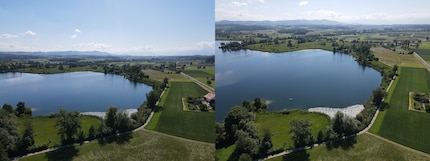 Das Bild links ist aus einer Höhe von 63 Metern entstanden, das rechte aus 100 Metern. Witzigerweise wirkt der See aus 100 Metern Höhe grösser, weil der Kamerawinkel anders ist. Je höher ich steige, desto eher richte ich die Kamera nach unten.