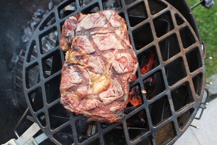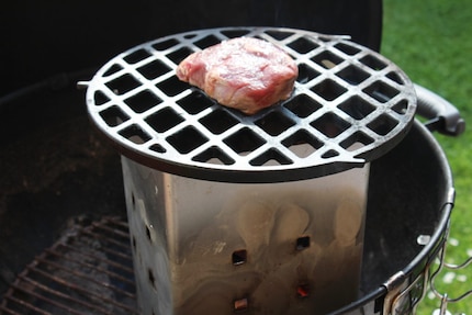 Alle anzeigenEin prima Tipp ist es übrigens auch, das Steak direkt auf dem Grillkamin anzugrillen (aka der Chimney Griller). Nimm dir relativ wenig Kohle für den Kamin, und wenn es richtig schön glüht, setzt du den Grillrost auf den Kamin und grillst das Steak an. Tipp: Der Gusseisen-Einsatz des GBS ist dafür ideal (siehe Foto). Nach dem Angrillen schüttest du die Kohlen in den Kugelgrill. Dadurch, dass du nur wenig Kohle genommen hast, hast du auch nicht allzu hohe Temperaturen im Grill. Jetzt kannst du das Steak fertig garen.