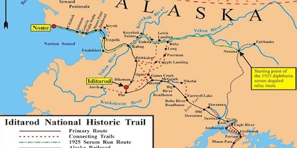 Die Originalstrecke aus 1925, inklusive der Ortschaft Iditarod, die als Namensgeber für das Rennen fungiert.