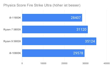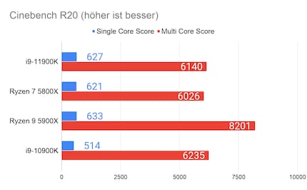 Im Vergleich zum Vorgänger ist der Unterschied im Single Core enorm: Rund 22 Prozent mehr sind’s. Im Multi Core liegt der 11900K trozt 2 Kerne weniger nur knapp 2 Prozent hinten.