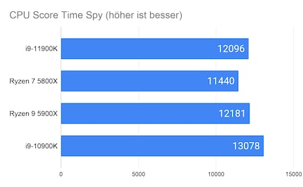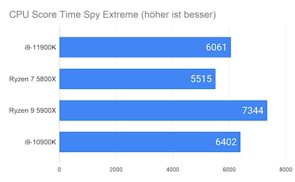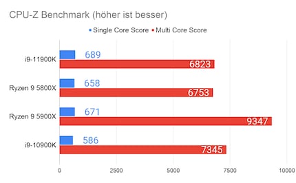 Im Single Core des Benchmarks von CPU-Z liegt der i9-11900K vor allen anderen. Stolze 689 Punkte erreicht der Intel-Prozessor, knapp 3 Prozent mehr als der 5900X. Den 5800X distanziert er gar um knapp 5 Prozent und den Vorgänger 10900K um fast 18 Prozent. Und auch im Multi Core schlägt der i9-11900K zu: Hier liegt der 5800X mit ebenso vielen Kernen hinten. Der Vorgänger mit zwei zusätzlichen Kernen schafft rund 8 Prozent mehr.