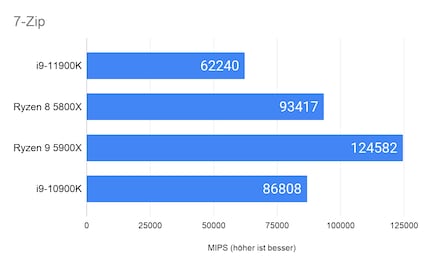 Beim integrierten Benchmark von 7-Zip – ich wähle die Standard «Dictionary size» von 32 MB – sackt der i9-11900K im Vergleich zum Ryzen 5800X, 5900X und i9-10900K ordentlich ab. Mit 62 240 Instruktionen pro Sekunde (MIPS) liegt der Rocket-Lake-Chip rund 39 Prozent hinter dem Comet Lake i5. Das liegt nicht nur an den zwei Kernen weniger, sondern wohl auch an der L3-Cache-Latenz, die beim 7-Zip-Benchmark entscheidend ist. Das hat schon Anandtech beim Vorab-Review des i7-11700K festgestellt. Mit 45 bis 46 Zyklen liegt der Rocket Lake Chip dort 3 bis 4 Zyklen hinter dem Comet Lake Chip. Das muss beim i9-11900K ähnlich sein. Beim AIDA64 Cache & Disk Benchmark liegt die L3-Cache-Latenz bei 12,6 ns. Beim i9-10900K sind’s nur 11,4 ns. Das wird dann bei gewissen Games wieder eine Rolle spielen. Im Vergleich zur Konkurrenz von AMD ist der Unterschied noch grösser: Der 5800X liegt um rund 50 Prozent vorne. Ein Vergleich zum 5900X ist zwar aufgrund der 4 Kerne unfair, die CPU erreicht aber 100 Prozent mehr MIPS.