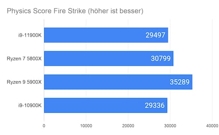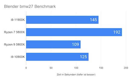 Blender-User gucken beim i9-11900K in die Röhre. Zwar rendert der Ryzen 5800X die Szene deutlich langsamer, dafür ist der Intel-Vorgänger dank zwei Kernen mehr 20 Sekunden schneller. Deutlich am schnellsten ist der 5900X.