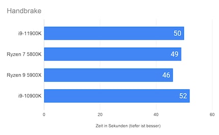 In Handbrake liegen alle CPUs nahe beieinander. Der i9-11900K sowie sein Vorgänger müssen sich jedoch den AMD-Chips geschlagen geben. Den 88 Sekunden langen, 645 MB grossen 4K Trailer von «The Dark Knight Rises» encodiert der 11900K mit den «Fast 1080p30»-Voreinstellungen in 50 Sekunden. Damit ist er 2 Sekunden schneller als sein Vorgänger.