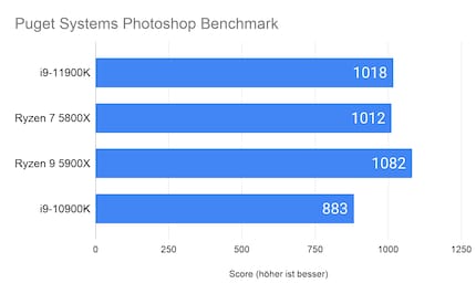 Beim Photoshop Benchmark liefern sich 11900K und 5800X ein Kopf-an-Kopf-Rennen, das der 11900K mit nicht einmal einem Prozent Vorsprung für sich entscheidet. Im Vergleich zum Vorgänger liegen jedoch satte 15 Prozent mehr drin. Gegen den 5900X bleibt der Intel-Prozessor 6 Prozent hinten.