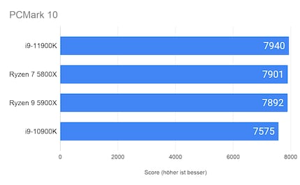 Der PCMark 10 Benchmark testet diverse Szenarien wie die Ladezeit von Apps, Effizienz bei Tabellenkalkulationen, Browsen oder auch Foto- und Videobearbeitung. Daraus berechnet er einen Score. Mit 7940 Punkten setzt sich der 11900K an die Spitze. Der Unterschied ist mit nicht mal einem Prozent im Vergleich zum 5800X und 5900X jedoch marginal. Immerhin reicht’s für 5 Prozent mehr im Vergleich zum Vorgänger. Der Benchmark zeigt, dass im Office-Betrieb keine riesigen Leistungssprünge zu erwarten sind.