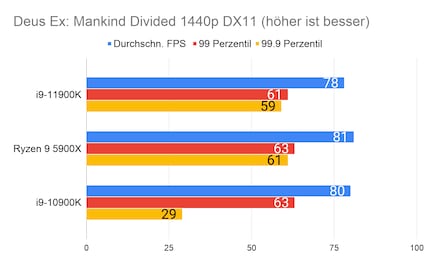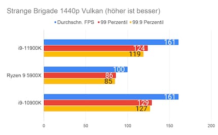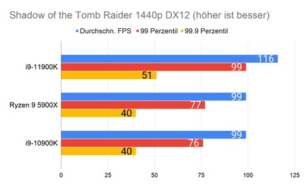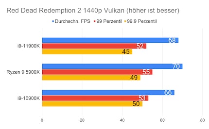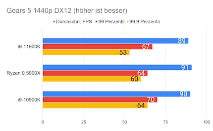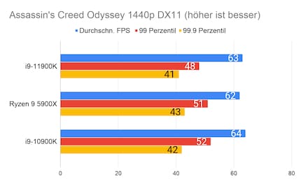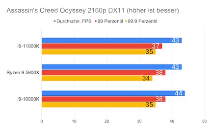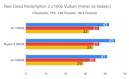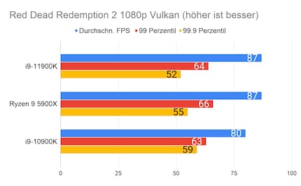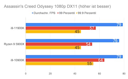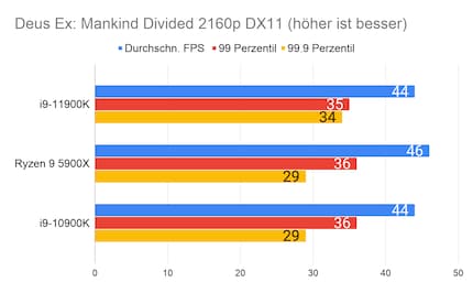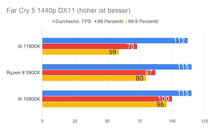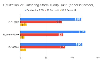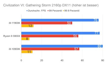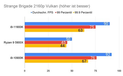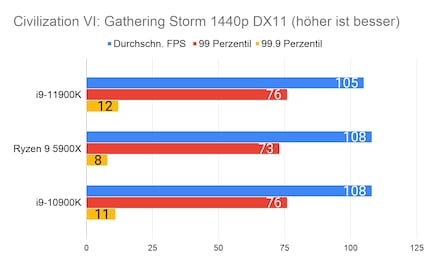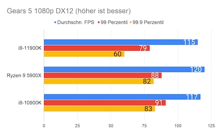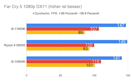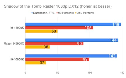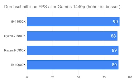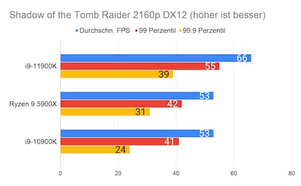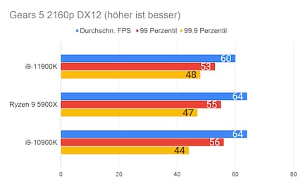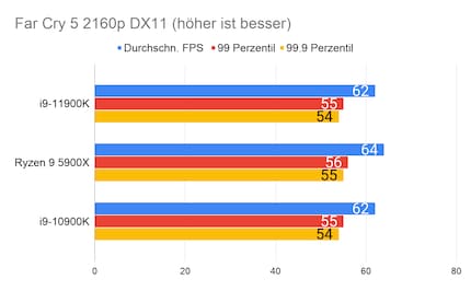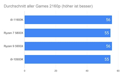 In 1080p-Auflösung liegt der 11900K 2 FPS vor dem 10900K. Bei der Konkurrenz von AMD sind’s 3 vor dem 5800X und 1 hinter dem 5900X. Nur in 1440p-Auflösung liegt der 11900K ganz vorne. Der Vorsprung beträgt jedoch lediglich 1 FPS. In 2160p-Auflösung liegen der 11900K und der 5900X gleichauf. Die Unterschiede bei den Games sind also marginal.