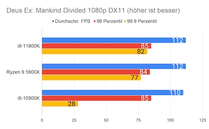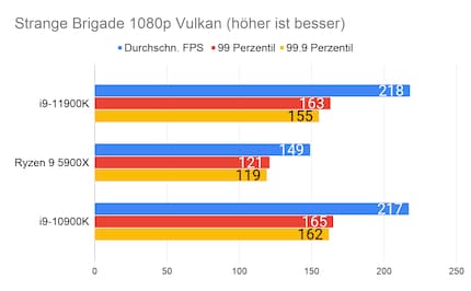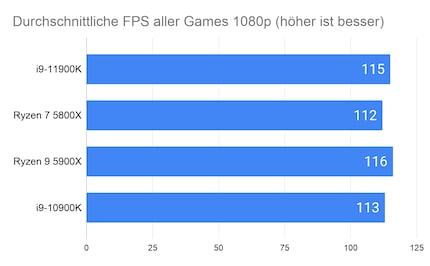 Vergleiche ich die einzelnen Games, ist der 11900K mal schneller und mal langsamer als der 10900K. Die Unterschiede sind – bis auf wenige Ausnahmen – jedoch gering. Das zeigt sich auch bei den Durchschnittswerten über alle Games hinweg: