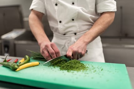 Ivans wichtigstes Werkzeug - natürlich das Messer. Und sein Mund. Ohne ständige Anweisungen an seine 12 Kollegen in der Küche geht nichts. Gemüse, Kräuter etc. schneidet er mit seinem eigenen Messer. Es ist immer scharf und jeder in der Küche weiss, dass Ivans Messer nichts in anderen Händen verloren hat.