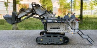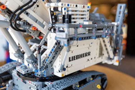 Der Liebherr hat einen Technic-Hub mehr verbaut und dadurch auch mehr Funktionen als der CAT. Das Kettenfahrwerk funktioniert fast identisch wie beim CAT. Auch hier kannst du vor- und rückwärtsfahren, sowie nach links oder rechts drehen. Zudem besitzt der Liebherr ein Drehkreuz. Das erlaubt dir, den oberen Teil des Baggers um 360 Grad zu drehen. Für die Bedienung des Baggerarms hast du zwei Joysticks. Damit kannst du den Ausleger in alle möglichen Richtungen anheben oder senken. Die Schaufel lässt sich zudem auch nach vorne aufkippen, wodurch der Inhalt entleert wird.