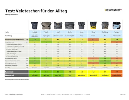 Die Schweiz fährt Velo. Vergangenes Jahr gingen über eine halbe Million neue Drahtesel in den Verkauf, so viele wie noch nie. Der Kassensturz hat nun Velotaschen von acht Herstellern auf ihre Tauglichkeit im Alltag testen lassen. Fazit: Die Hälfte davon schneidet gut bis sehr gut ab.