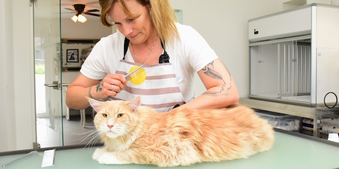 Klar, Franky vertraut seinem Frauchen. Aber fremde Katzen? Da hat Cécile Riner ein einfühlsames Händchen. Vor jeder Behandlung nimmt sie sich Zeit, die Katze mit Streicheleinheiten einzudecken und an sich zu gewöhnen. «Ich konnte schon die wildesten Vierbeiner besänftigen», sagt sie und lacht. «Gebissen wurde ich erst ein einziges Mal.» Das will etwas heissen, bei 100 bis 130 Katzen pro Monat.