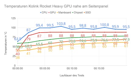 Noch etwas zu meiner Testmethode. Ich lasse die Stresstests AIDA64 (für die CPU) und FurMark (für die GPU) während 20 Minuten laufen. So kann ich schauen, wie gut der Airflow des Rocket Heavy ist – also wie effizient frische Luft in das Gehäuse und heisse Luft aus dem Gehäuse transportiert wird. Währenddessen messe ich mit HWiNFO64 die Temperatur von CPU, GPU, SSD, Mainboard und Chipset. Dabei lasse ich die Lüfterkontrolle im BIOS auf Standard. Nach jeweils zwei Minuten notiere ich die Temperaturen. Dabei sind folgende Komponenten im Gehäuse verbaut: