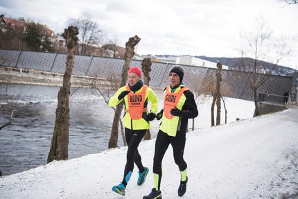 Bei ihren Läufen haben die beiden ein ordentliches Tempo drauf. Hans-Peter bewältigt den Halbmarathon in unter 1:45:00. Seine Bestzeit über 42.195 Kilometer liegt bei 3:54:00. Bei solchen Zeiten stösst auch Guide Mike an seine Grenzen. Schliesslich muss er nicht «nur» mitlaufen, er muss Hans-Peter vor allem sicher ins Ziel führen. Die beiden schmunzeln, als ich wissen will, wer denn auf wen Rücksicht nehmen muss. Das entscheide die Tagesform, lautet die diplomatische Antwort.