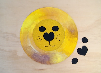- Schneide aus schwarzem Bastelpapier die Augen und die Herznase aus. Ergänzend kannst du mit dem Marker vorsichtig den Mund und die Schnurrhaare zeichnen.