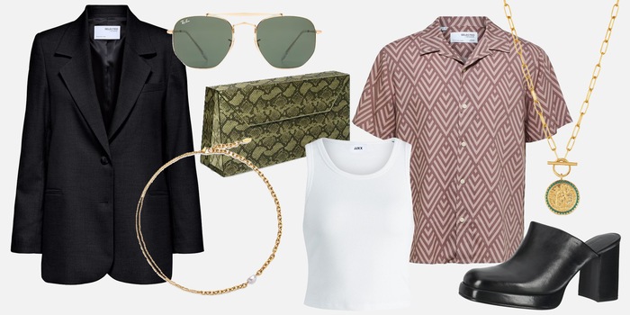 Die passende Sonnenbrille habe ich schnell gefunden: Ray Ban, Pilot, filigraner Goldrahmen. Dazu muss ich nur noch den richtigen Schmuck kombinieren, suche mir ganz à la Nadia eine lange Goldkette mit Medaillon-Anhänger. Der Name «Gold Digger» überzeugt mich sofort. Und weil doppelt bekanntlich besser hält, gibts obendrauf noch eine zweite Kette, diesmal kurz und mit Perlendetail. In Sachen Blazer muss man mich generell nicht lange bitten. Auf das Exemplar von Selected Femme habe ich schon länger ein Auge geworfen. Und da wie gesagt die Sommersaison lauert, entscheide ich mich für unten drunter für ein Tanktop plus Kurzarmshirt. Nicht gerade eine Rüstung to go, dafür ein Hauch Hawaii-Hemd-Feeling. Auch gut, oder?