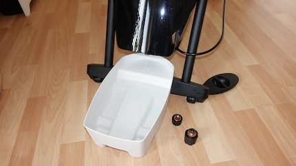 Der Schein trügt: Das Bügelsystem ist in Nullkommanichts aufgestellt.Nachdem ich alles aufgestellt, den Anti-Kalkfilter eingesetzt und den Wassertank aufgefüllt habe, ist das Ausspülen des Dampferzeugers an der Reihe. Hierfür verwende ich das mitgelieferte Mini-Becken, das das Wasser aus dem Dampfbehälter auffängt. Dieser Vorgang ist vor dem ersten Gebrauch und danach einmal pro Monat durchzuführen.