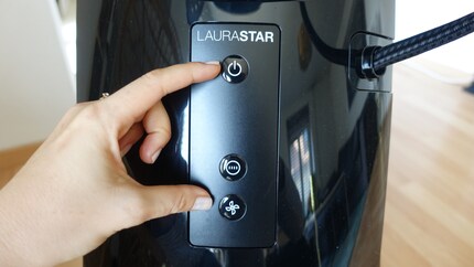 Nach dem Befüllen des Wassertanks schraube ich den Ablass - und Einfüllverschluss am Dampfbehälter ab. Das Entkalken dauert nur einige Minuten.Nach zehn Minuten ist mein Laurastar einsatzbereit. Weitere drei Minuten vergehen, bis er aufgestartet ist. Das System ist relativ laut und erinnert mich an das Geräusch einer Kaffeemaschine. Mein Hund schaut mich irritiert an und verkrümelt sich ins Gästezimmer.