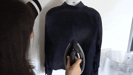 Ich beginne mit einem schwarzen Hoodie, weil hier nicht viel schiefgehen kann. Langsam gleite ich mit dem Bügeleisen über den Jersey. Das Resultat kann sich sehen lassen: Innert kürzester Zeit ist der Pullover faltenfrei. Die Kapuze, die zum Bügeln etwas umständlich ist, glätte ich mit dem Vertikaldampf. Hierfür halte ich den Hoodie in die Luft und bügle mit dem Bügeleisen drüber. Achtung: Den Hoodie halte ich am Saum fest, damit die Kapuze nach unten zeigt. Ich will mir schliesslich nicht die Finger am heissen (!!!) Dampf verbrennen. Mit dieser Methode solltest du übrigens auch Seidenblusen dämpfen. Hänge hierfür das Oberteil an einem Kleiderbügel auf und halte diesen am Griff in die Luft.