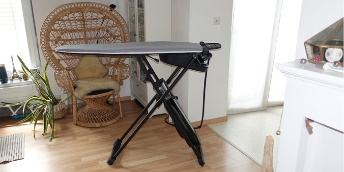 Gespannt stelle ich mich vor das höhenverstellbare Aktivbügelbrett, das eine Gebläse- und eine Ansaugfunktion hat. Erstere erzeugt ein Luftkissen, das die Kleidung in Form bringt. Die Ansaugfunktion sorgt hingegen dafür, dass der Stoff beim Bügeln nicht verrutscht. Dadurch soll ein schnelles Faltenbügeln möglich sein.