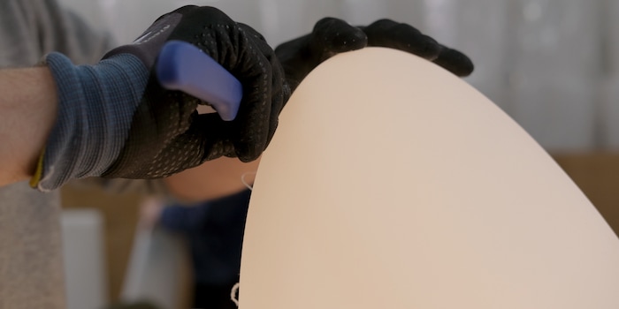 Es dauert zwar länger, einen Artikel mit diesem Verfahren herzustellen, aber es lohnt sich, weil danach nur noch ein Schritt zum fertigen Lampenschirm fehlt: An der Stelle, wo die zwei Formen aufeinandertreffen, steht wie bei einem Schoko-Hasen oder -Weihnachtsmann etwas Kunststoff über. Dieser kann im Nachhinein von Hand abgeschnitten werden.