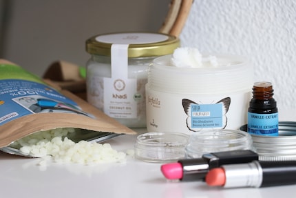 Erhitze in einer Pfanne unter ständigem Rühren einen Esslöffel Sheabutter, einen Esslöffel Kokosöl und dreiviertel Esslöffel Bienenwachs zusammen mit einem Stück des Lippenstifts. Diese Mengenangaben kannst du natürlich auf die Grösse deines Döschens skalieren. Bei mir reicht diese Menge für ein Tiegel mit einem Fassungsvermögen von 20 Millilitern. Je pigmentierter du deine Lippenpflege gerne hättest, desto mehr Lippenstift kannst du hinzu mischen. Fang mit wenig an und gib mehr dazu, bis die Farbintensität deinen Vorstellungen entspricht. Du kannst auch Lippenstifte mischen und so deine Wunschfarbe kreieren.