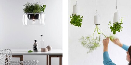 Ein hängender Kräutergarten ist eine charmante Lösung für Küchen oder Esszimmer mit wenig Platz. Links: Leuchte «Plant» von Markslöjd. Rechts: Blumentöpfe «Sky Planter» von boskke.Hat dir dieser Artikel gefallen? Dann könnten dich diese Beiträge ebenfalls interessieren: